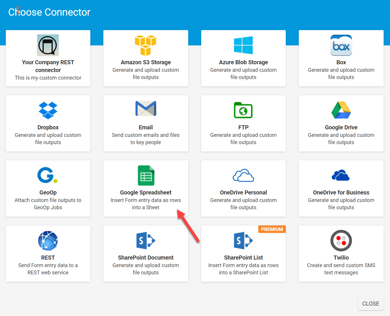 Once you are in the Connectors page, setting up a Google Spreadsheet Connector is easy: